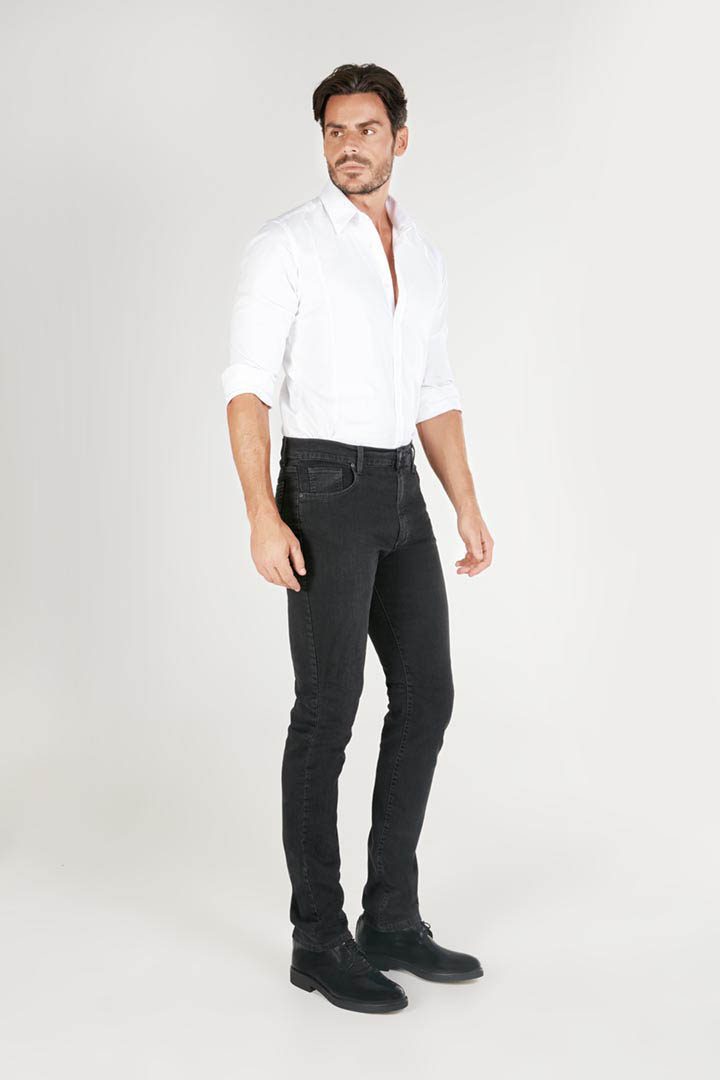 Denim black cinque tasche, vestibilità iconica del marchio HOLIDAY: REGULAR FIT, vita alta e fondo regolare. Realizzato in caldo cotone stretch, tessuto unico nel suo genere poiché dona un effetto denim nero lievemente sabbiato, soft touch, con una leggera garzatura interna, 9oz.