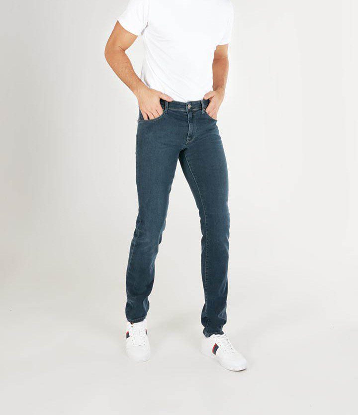 Con il suo inconfondibile lavaggio base denim blu-grey sovrapposto a sabbiatura tendente al grigio corda, il modello GIULIO, realizzato in tela denim soft touch, unico per comodità, è realizzato nella vestibilità SLIM FIT, essenziale, vita regolare, fondo gamba slim, in denim stretch 10oz.