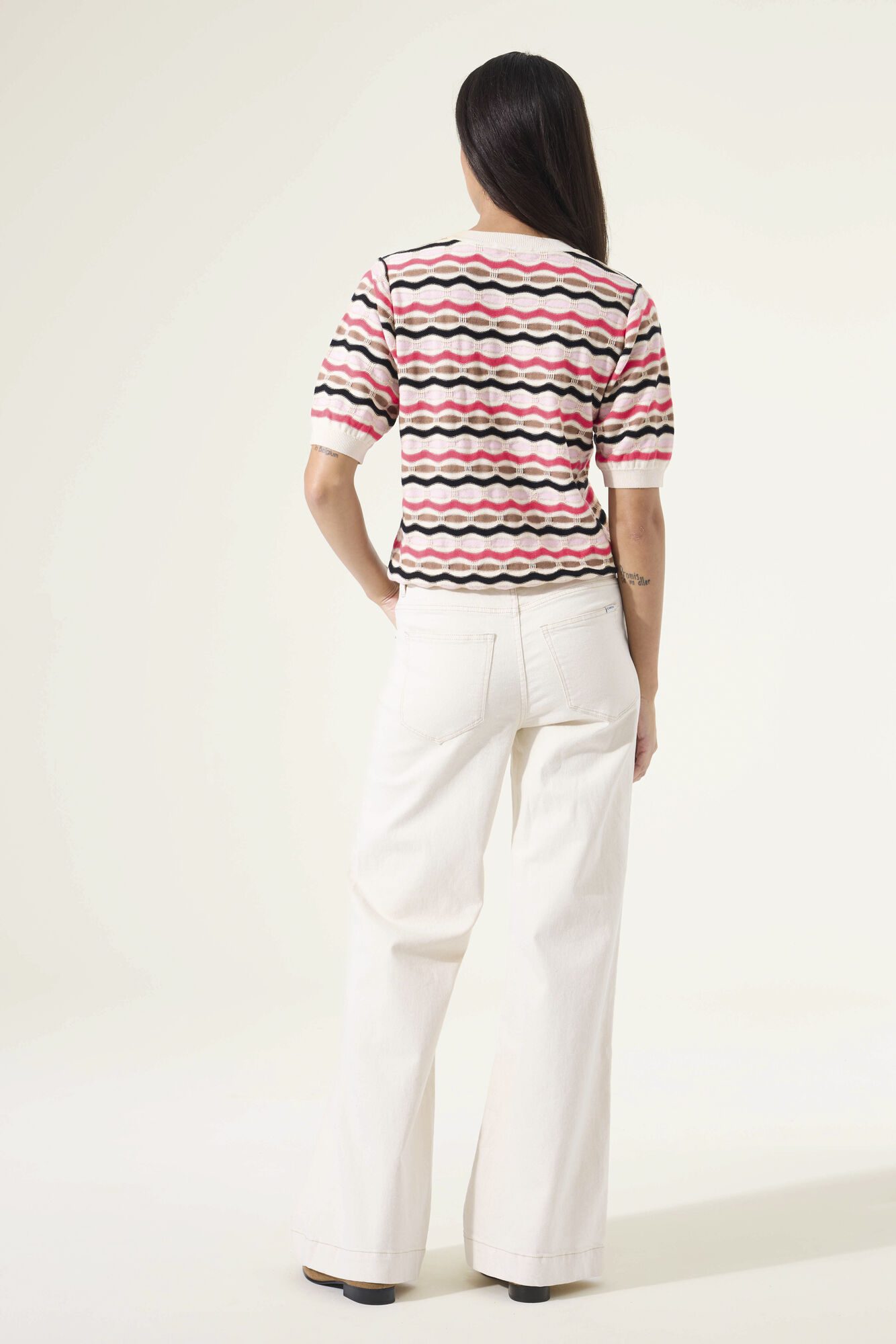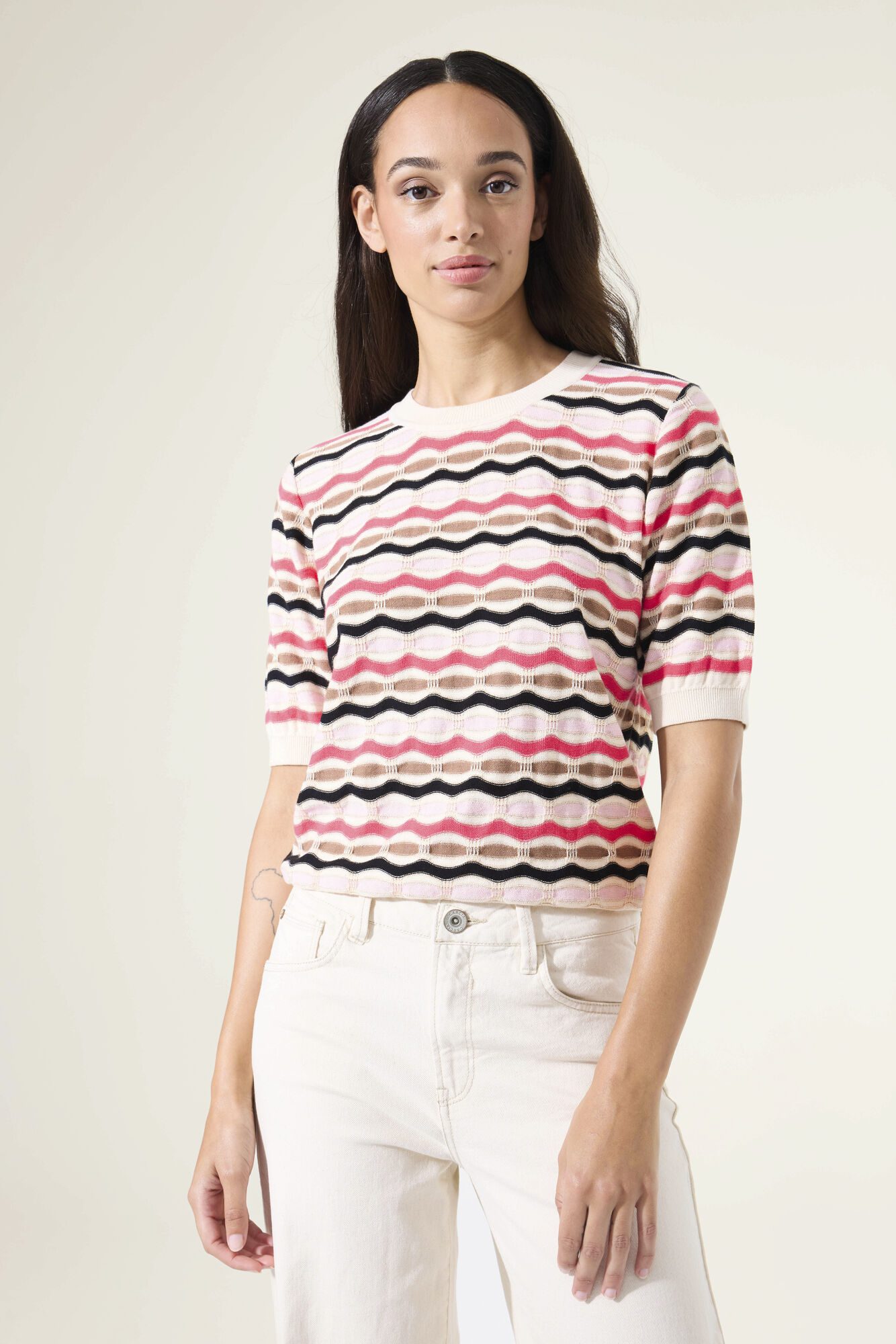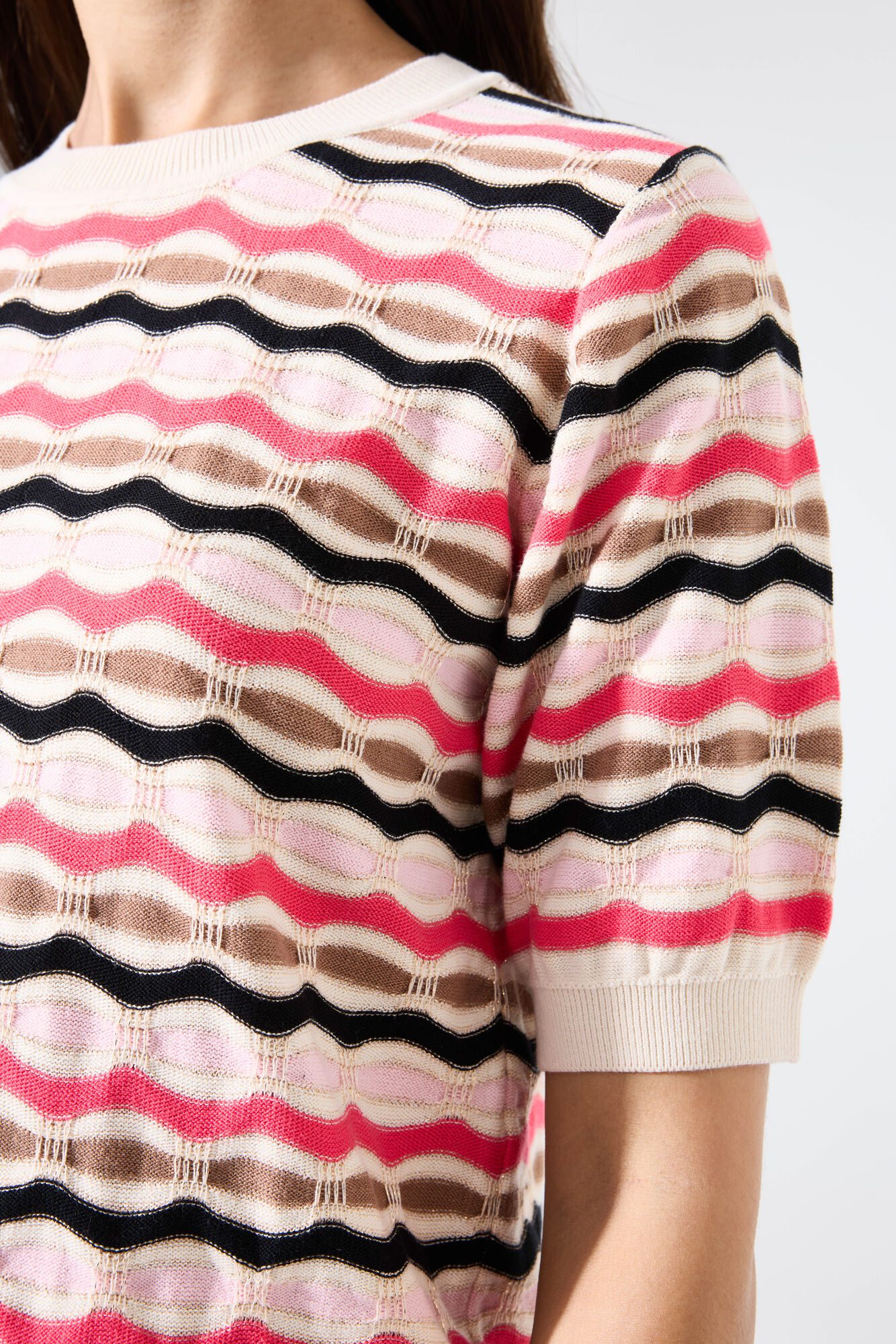 Maglione con un motivo d’impatto. Questo maglione presenta uno scollo rotondo, maniche corte e una vestibilità regolare. Questo capo è realizzato al 90% cotone e 10% filato metallico, il che gli conferisce un aspetto confortevole e giocoso.