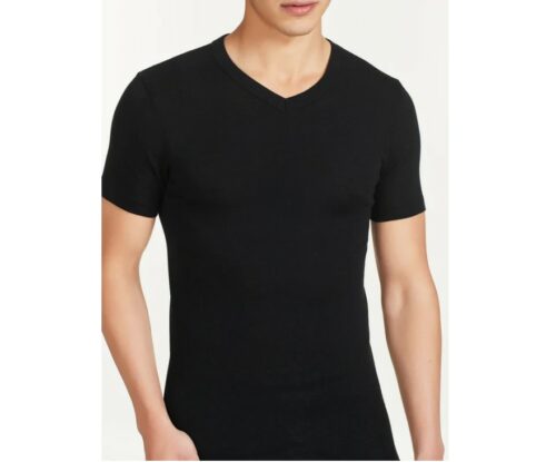 Maglietta scollo a V a manica corta in preziosa maglia unita di lana e seta.