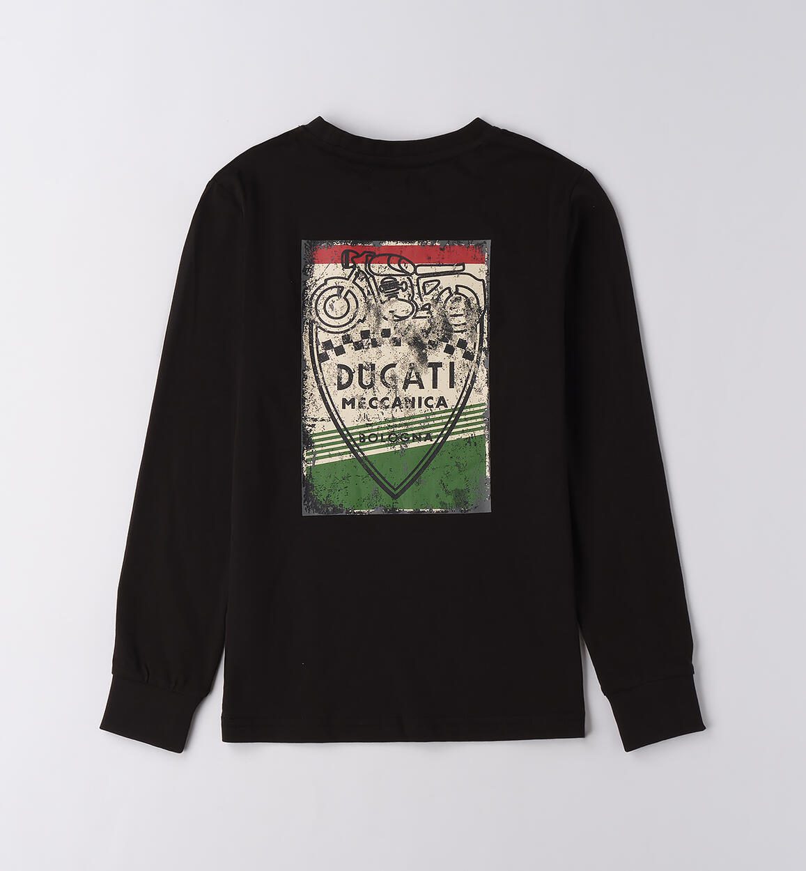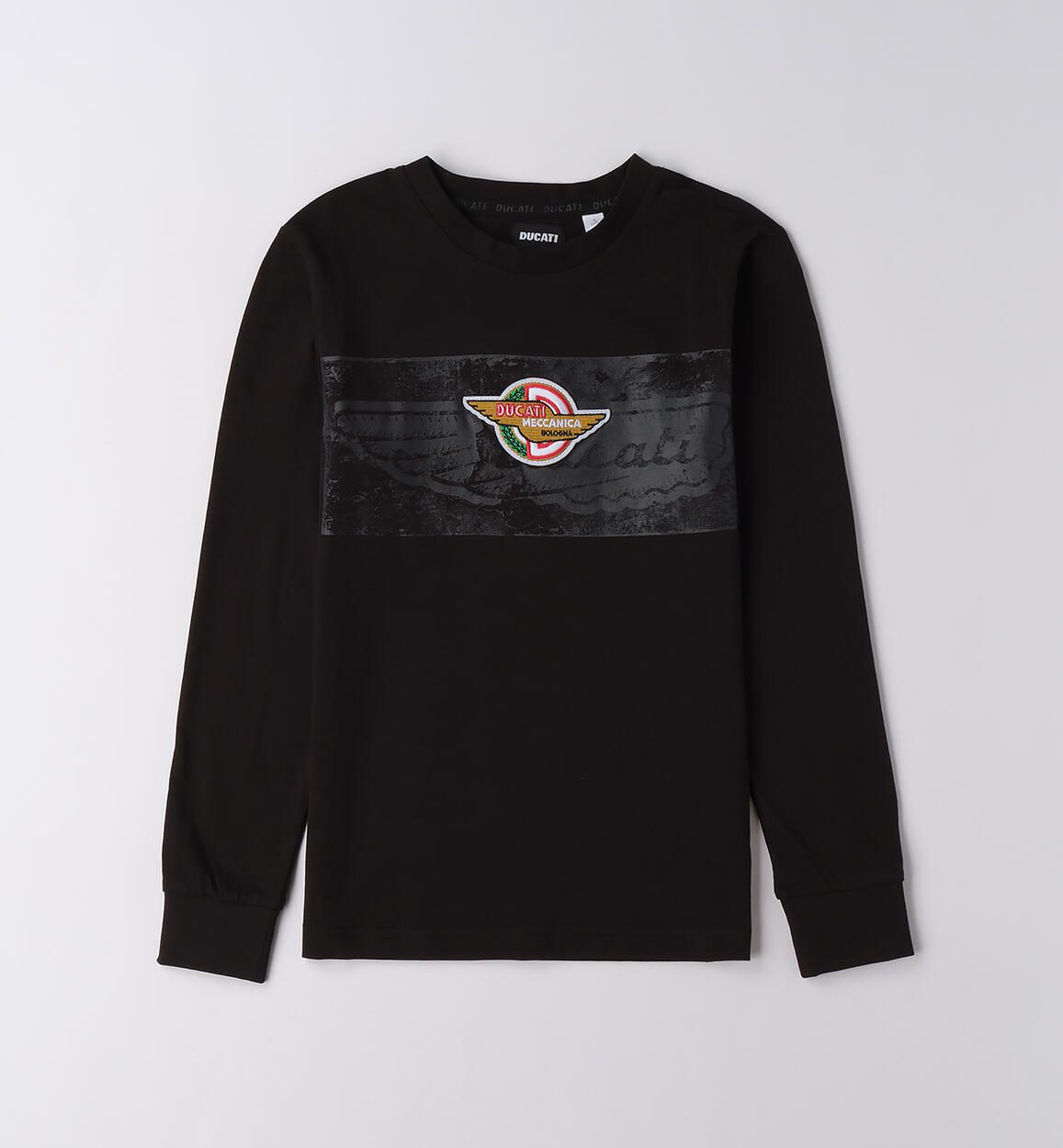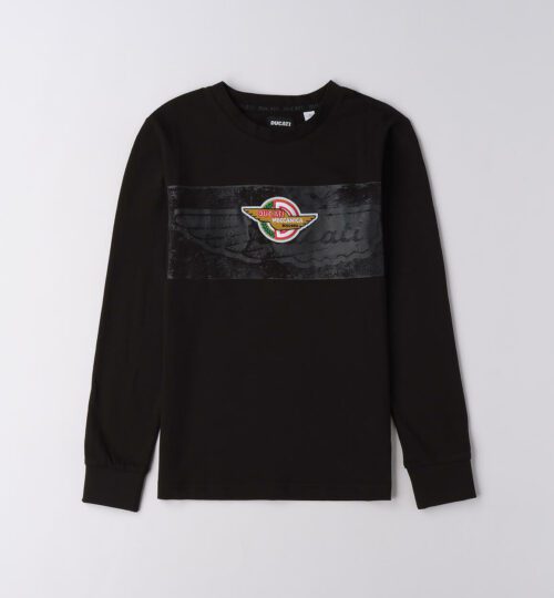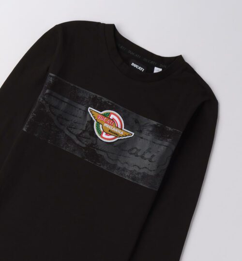 Maglietta Ducati per ragazzo realizzata in jersey 100% cotone a manica lunga. Modello girocollo con stampa davanti e badge in applicazione. Grande stampa dietro. Polsino sul fondo manica.